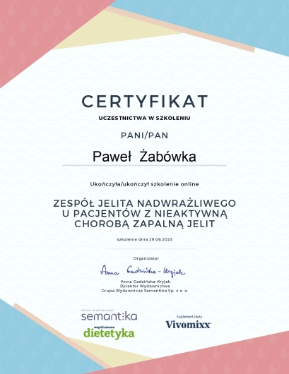 Regularny udział w szkoleniach i konferencjach naukowych pozwala mi na ciągłe poszerzanie wiedzy z zakresu żywienia osób chorych i zdrowych.